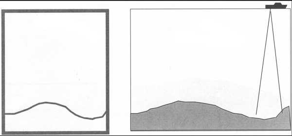 При измерении глубины вдоль правой границы экрана отображается в виде точки текущее значение измеряемой глубины. Для обеспечения возможности наблюдения за рельефом эта точка сохраняется на экране и сдвигается по нему справа налево на один шаг, а ее место занимает новая точка, соответствующая очередному отсчету глубины. Затем происходит следующий сдвиг так запоминается каждая последующая точка через промежутки времени, равные периоду следования зондирующих ультразвуковых импульсов. В результате на экране появляется линия, являющаяся отображением рельефа дна. Следует особо отметить, что полученная линия отображает рельеф на пути, уже пройденным судном, что следует учитывать при выборе позиции для ловли.